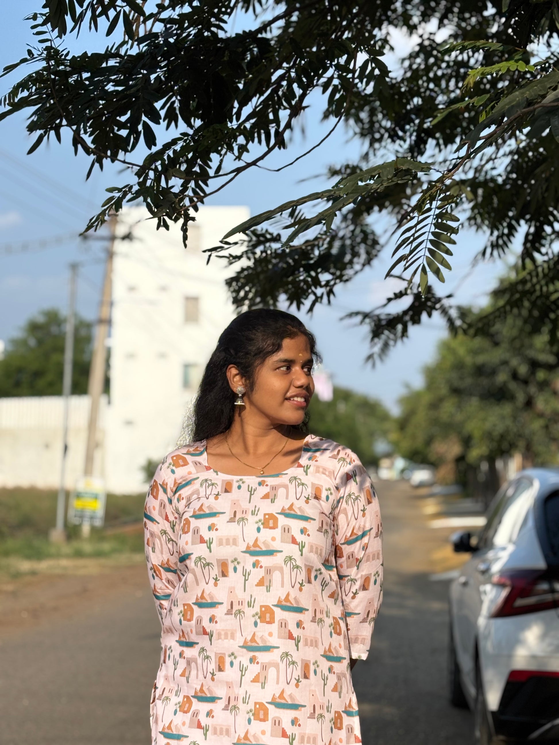 Embrace calm elegance with the Soft Desert Muse Kurti, designed in soothing pastel tones and hand-drawn desert-inspired prints. Crafted from smooth cambric cotton, this 44-inch kurti blends breathable comfort with timeless charm — ideal for sunny days, casual meetups, or creative workspaces. With its blush base and effortless silhouette, it’s your soft-spoken style statement. ✨