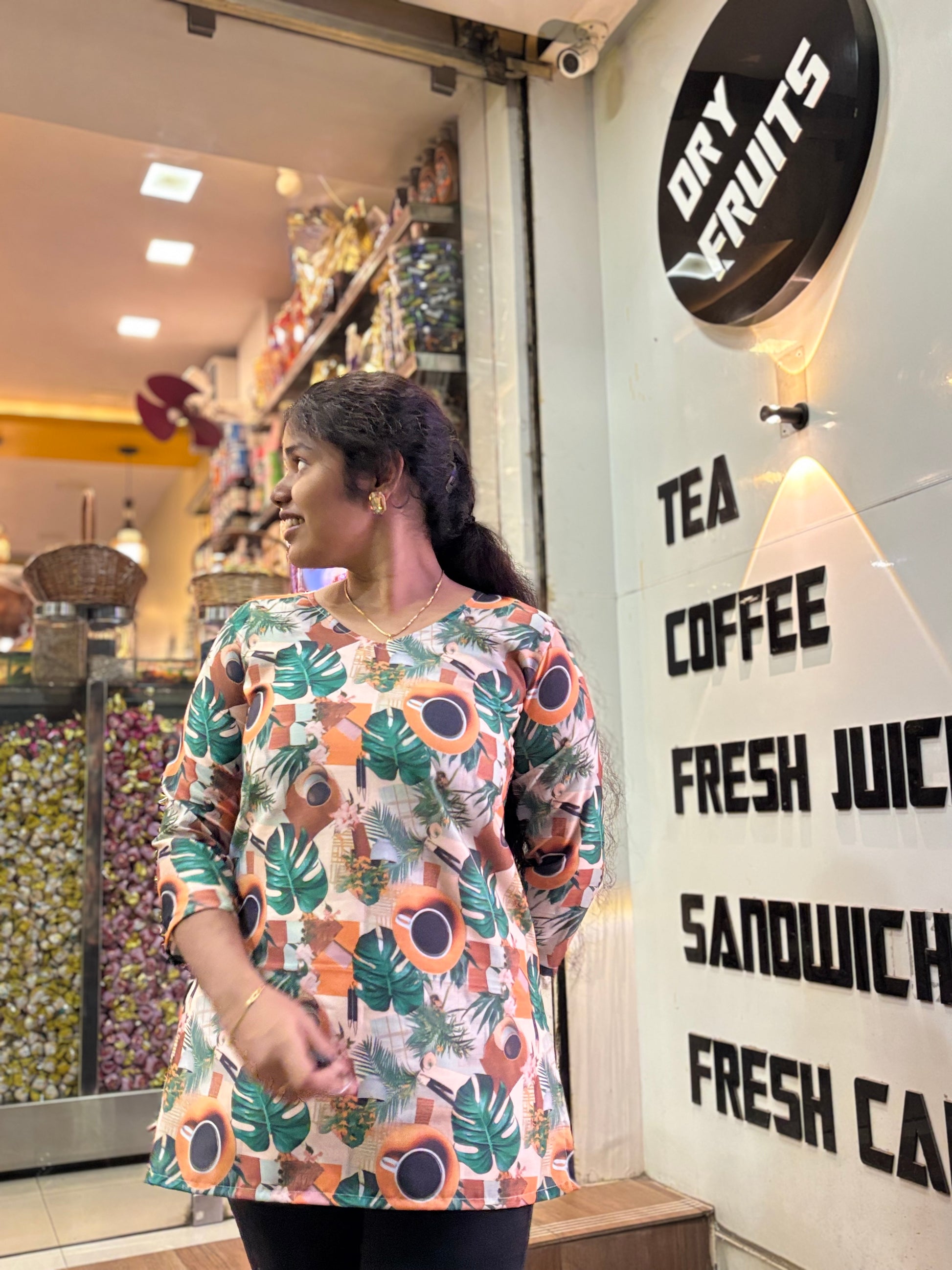 Step into playful elegance with the TropiCafe Short Top, your go-to pick for relaxed style. Crafted from breathable cambric cotton, this 28-inch beauty blends earthy tones with quirky prints of coffee mugs and tropical leaves. Whether it’s a café meetup, a market stroll, or a casual day out, this top pairs comfort with bold charm. 🌿💫